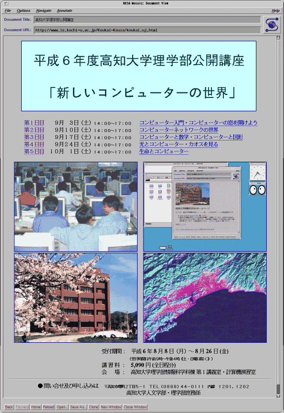 平成6年9月の理学部公開講座は、完成した情報科学科 が中心になって開催されました。以下、は、その記録です。
